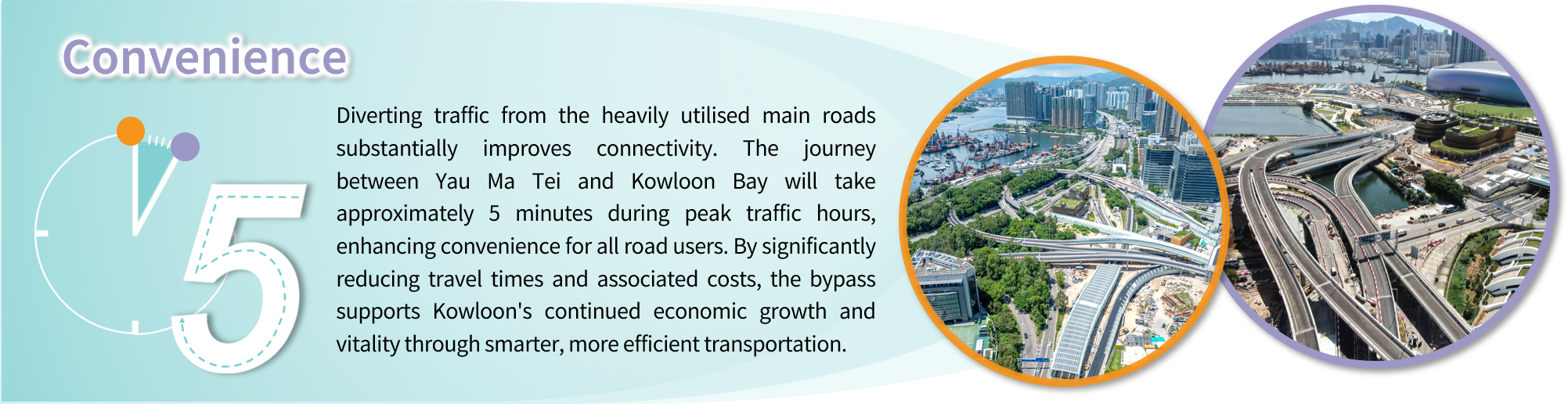 The Central Kowloon Bypass (Yau Ma Tei Section) has a total length of 4.7 km and features a dual three-lane design of carriageways. It connects the Yau Ma Tei Interchange in West Kowloon to the Kai Tak Development Area and the Kowloon Bay road network in East Kowloon, serving as a crucial corridor across central Kowloon. The bypass functions as an alternative express route, significantly reducing traffic flow in the existing congested major east-west traffic corridors. Upon road commissioning, the traffic can bypass the busy Central Kowloon area, significantly reducing travel time. During peak traffic hours, the travel time from Yau Ma Tei to Kowloon Bay can be shortened from approximately 30 minutes to just about 5 minutes. ​